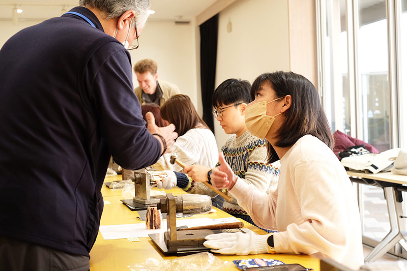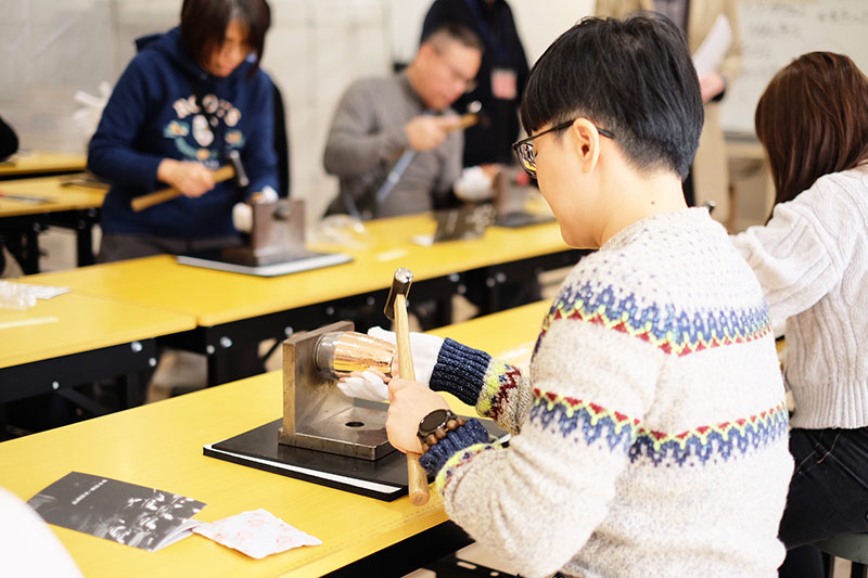 無形文化財鎚起銅器でも用いられる鎚目を入れる作業をタンブラーでご体験。