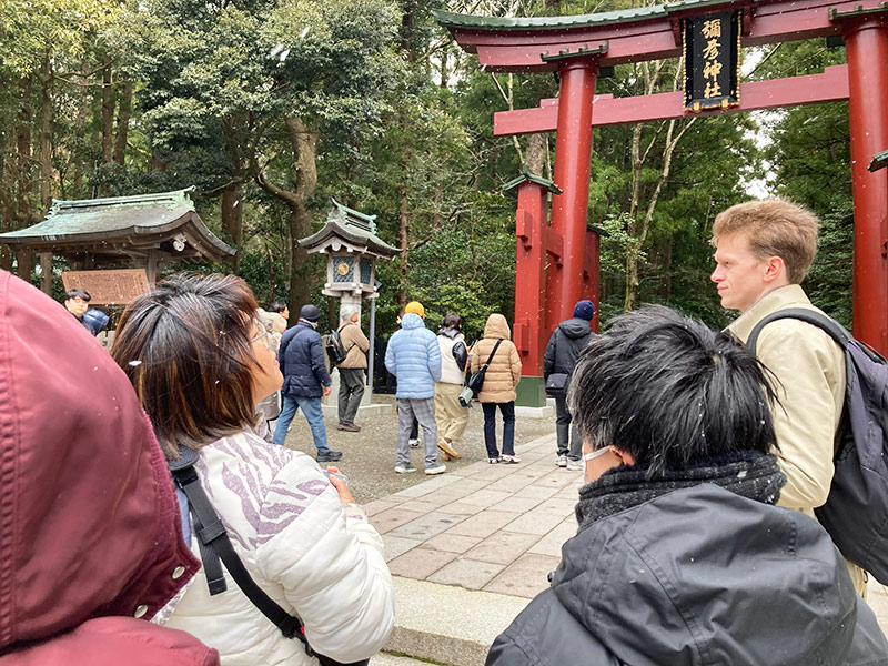 雪がちらちらと舞う中の参拝となりましたが、本殿の前では雲の隙間からお日様が見えて、朝の気持ちの良い空気の中、日本式の参拝も体験となりました。