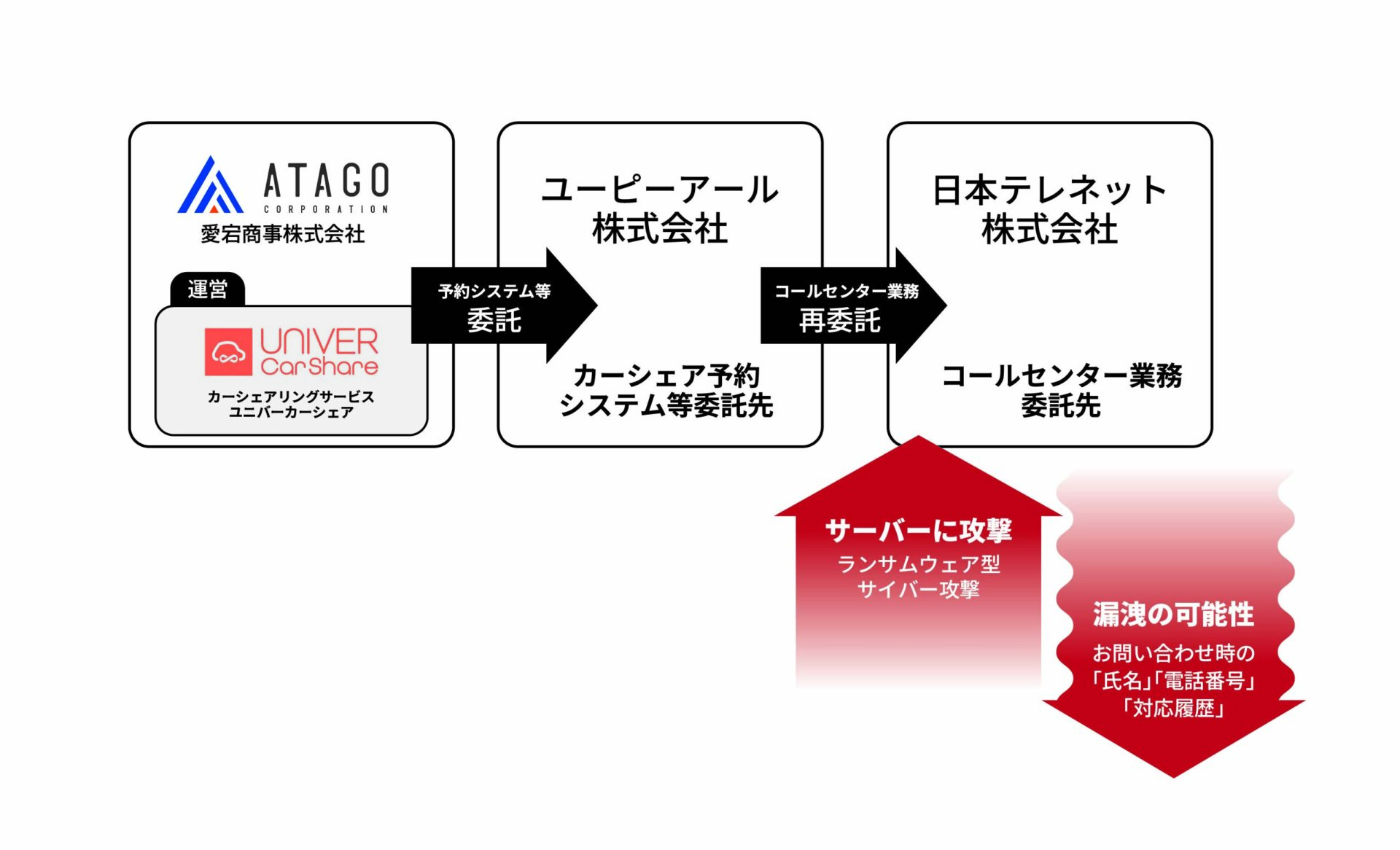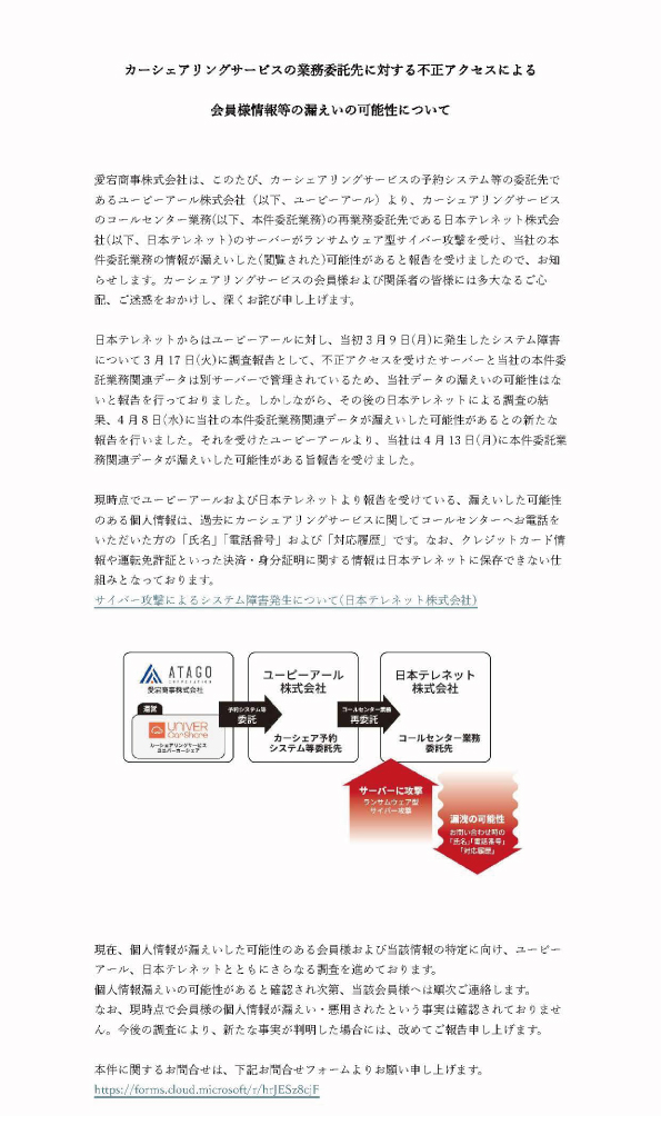 愛宕商事株式会社は、このたび、カーシェアリングサービスの予約システム等の委託先であるユーピーアール株式会社(以下、ユーピーアール)より、カーシェアリングサービスのコールセンター業務(以下、本件委託業務)の再業務委託先である日本テレネット株式会社(以下、日本テレネット)のサーバーがランサムウェア型サイバー攻撃を受け、当社の本件委託業務の情報が漏えいした(閲覧された)可能性があると報告を受けましたので、お知らせします。カーシェアリングサービスの会員様および関係者の皆様には多大なるご心配、ご迷惑をおかけし、深くお詫び申し上げます。
